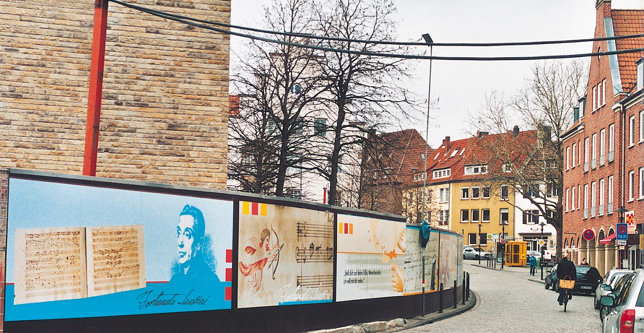 Zum Bau der neuen Diözesanbibliothek des Bistums Münster: Die Gestaltung des Bauzauns (350 laufende Meter) dieser Großbaustelle sowie der dazugehörigen Broschüre